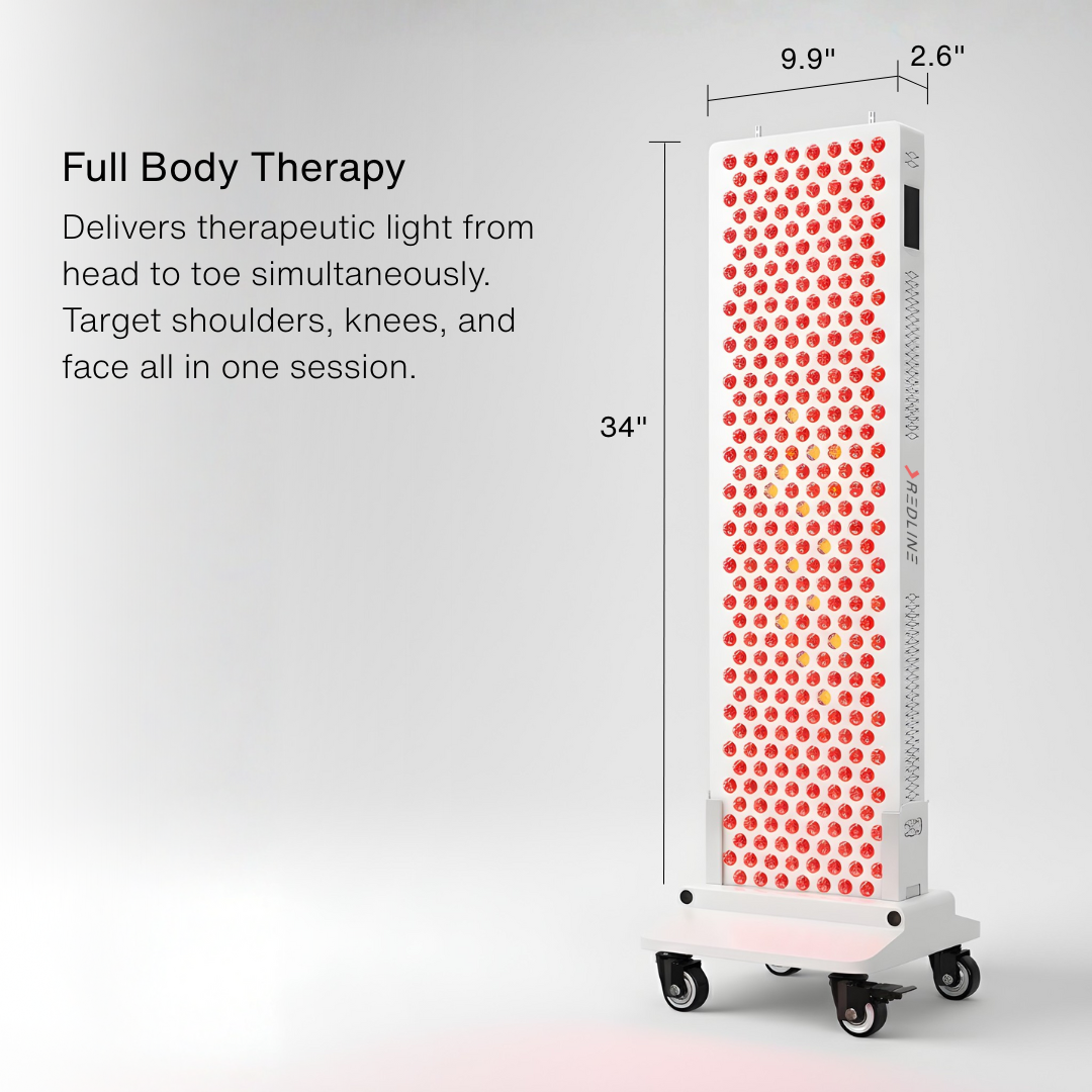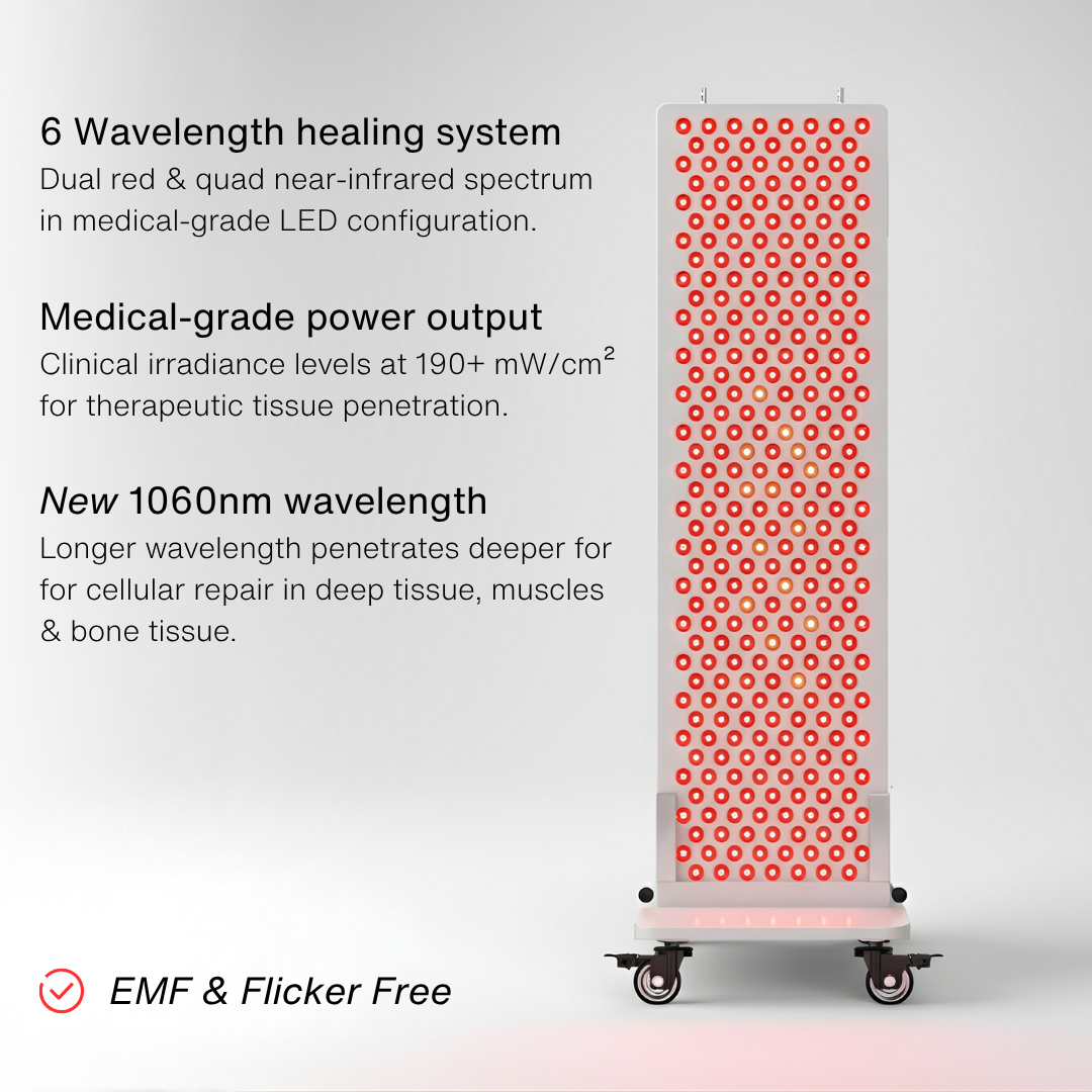 The Redline Pro takes red light therapy to the next level with a fully integrated, 6 wavelength design. Engineered for whisper-quiet operation and medical-grade power delivery at over 130mW/cm², it delivers professional-strength results every time you step into the light. Control your wellness sessions effortlessly with smartphone connectivity, and enjoy the precision of 6 therapeutic wavelengths designed for comprehensive cellular repair and recovery. From its flicker-free operation to its ultra-low EMF construction, every detail of the Redline Pro panels are designed for those who expect real results.